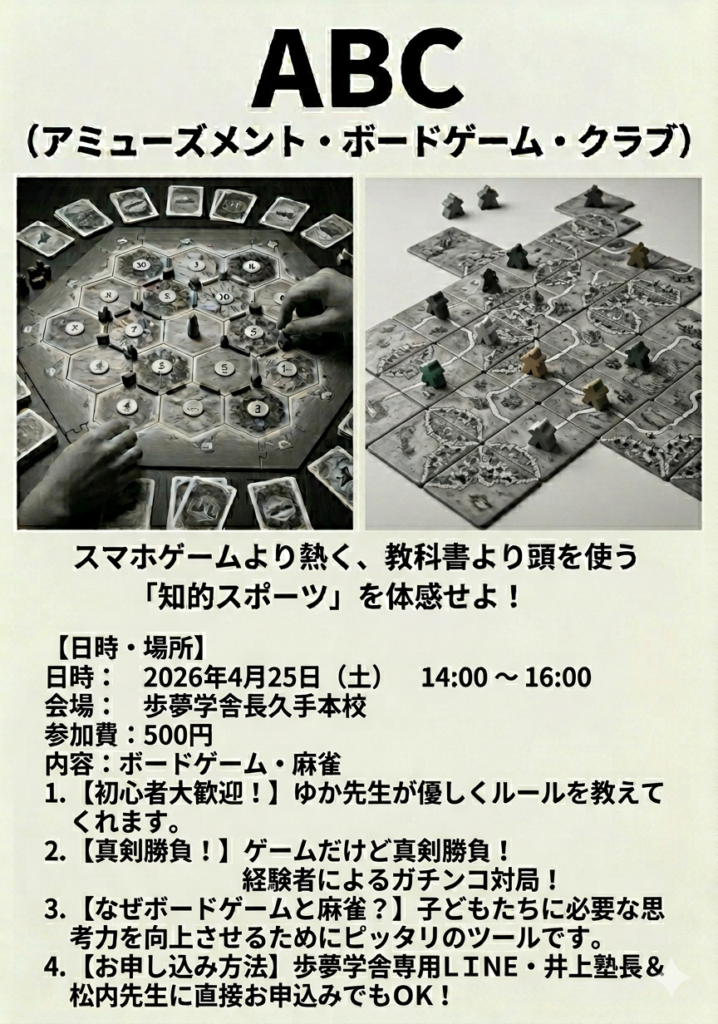 アミューズメント・ボードゲーム・クラブ(ABC)では、子どもたちの思考力を育むためのイベントを開催いたします。スマホゲームとは一味違う、手と頭、そして心を使って楽しむ「知的スポーツ」の世界を、ぜひこの機会に体験してください。